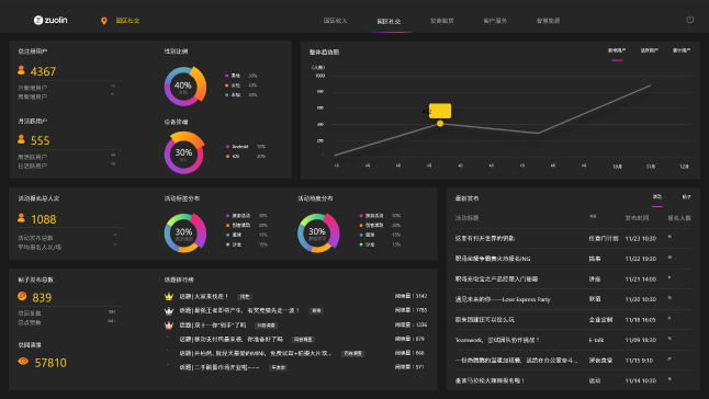 實時掌握用戶動態(tài),描繪用戶畫像園區(qū)注冊用戶、活躍用戶、帖子數、活動參與情況等