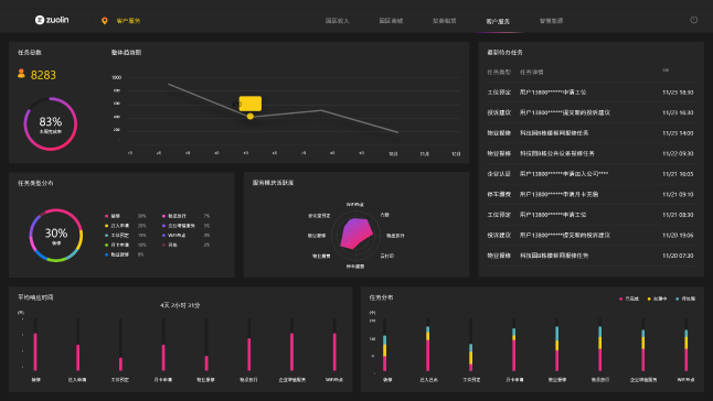 智慧辦公數據一覽,提升服務質量裝修、遷入遷出申請、物業(yè)報修、物品放行、最新代辦任務等